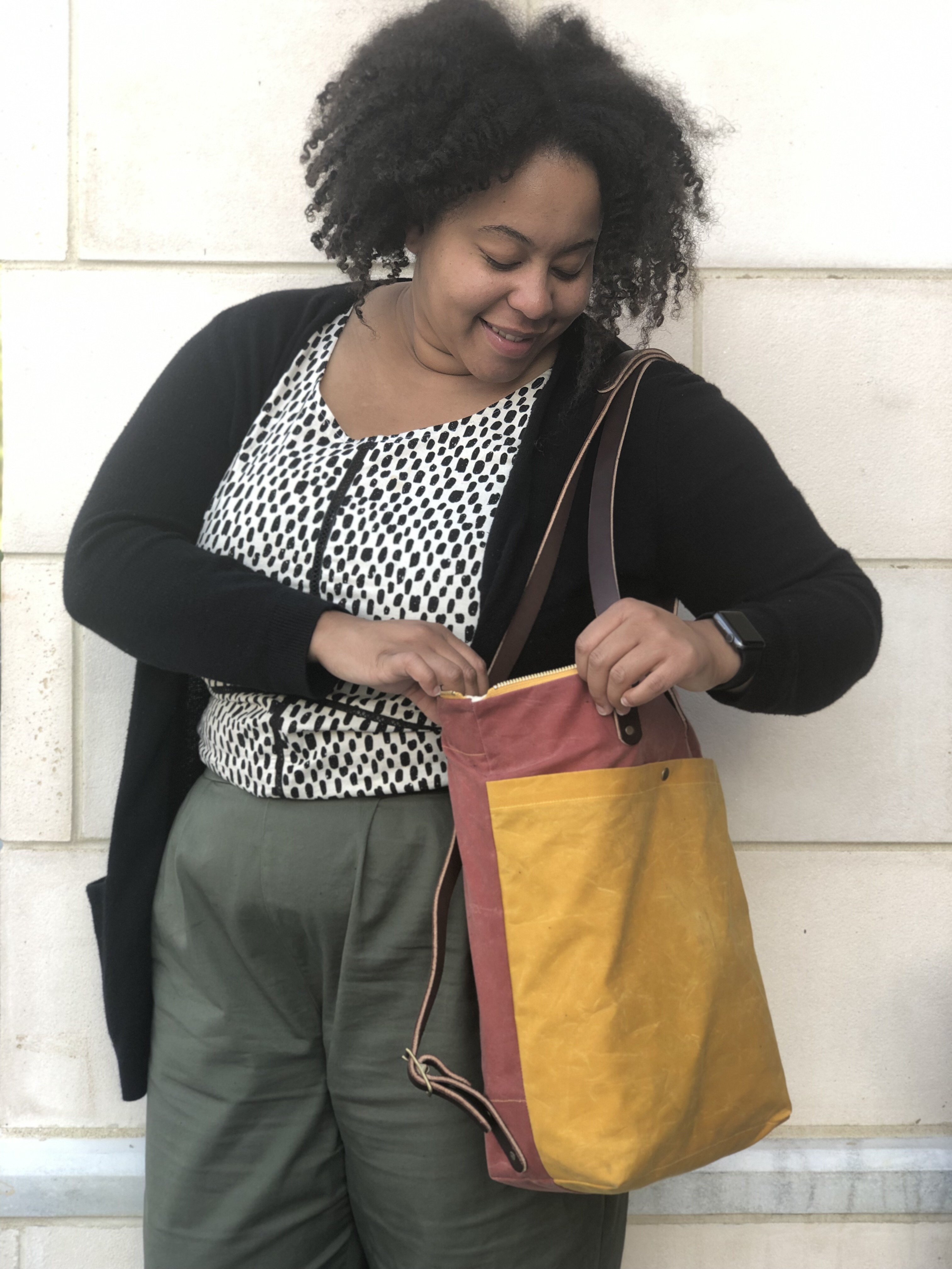 I really enjoyed making this bag and I definitely want to play with different color combinations, printed fabric, and additional pockets. I can see myself making this again maybe even as a gift. It’s a versatile bag and I like having the option of using it as a shoulder bag or a book bag.