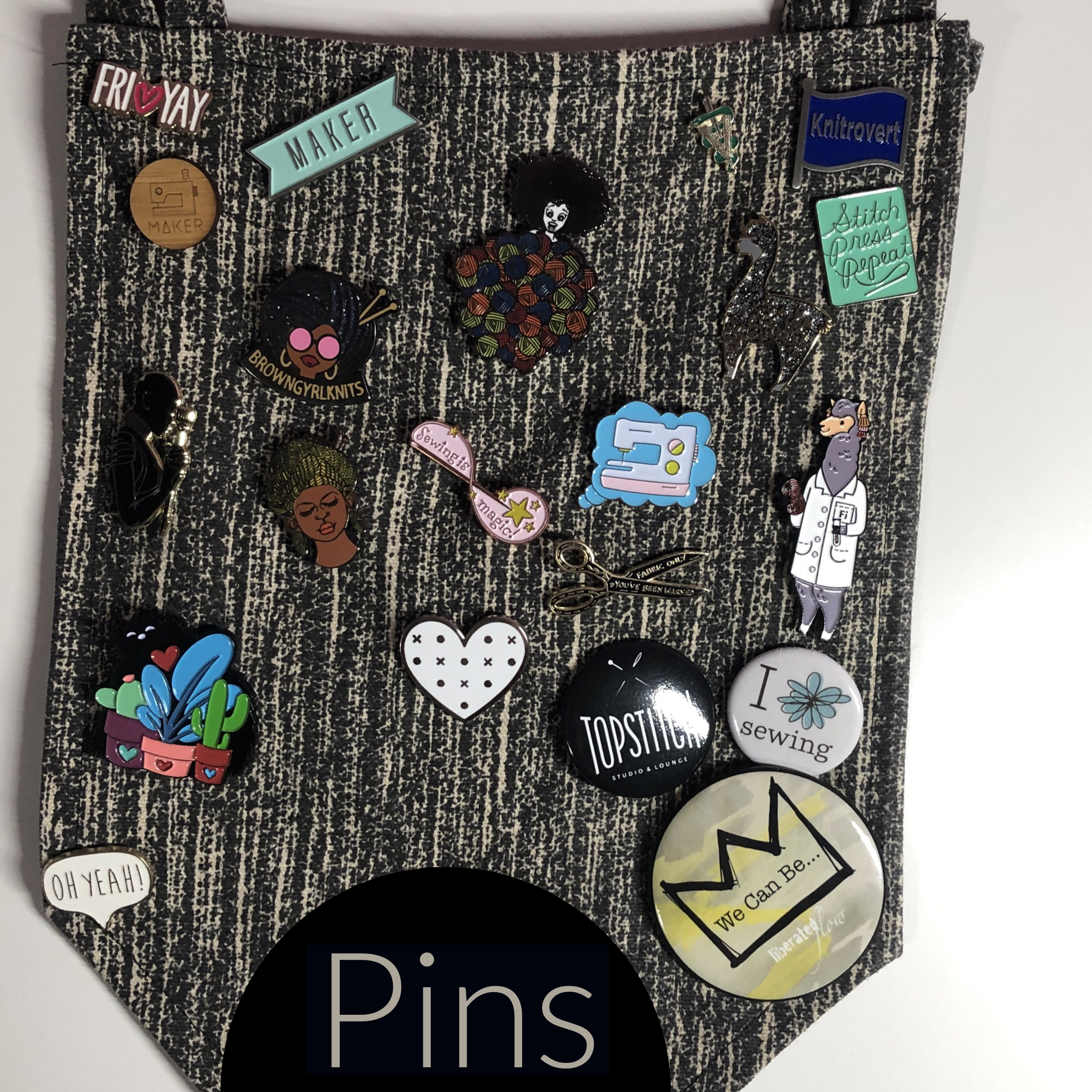 The last personalization option I’ll show you is something a bit less permanent than the previous ones. Pins and buttons are a really fun way of personalizing your bag. You can change them out as often as you’d like. I’ve accumulated a good amount of pins and I recently made a crest to display them. I’ve got pins related to sewing, knitting, art, and black culture. I can add and remove them depending on my mood that day. You can find all sorts of pins these days. I picked up some of the knitting specific pins at my local yarn store. I suggest putting them in an area that doesn’t get too stressed, just so you don’t accident knock them off. You can also find pin backs that lock in place.