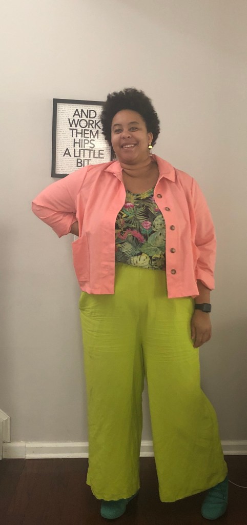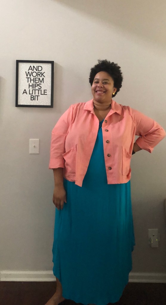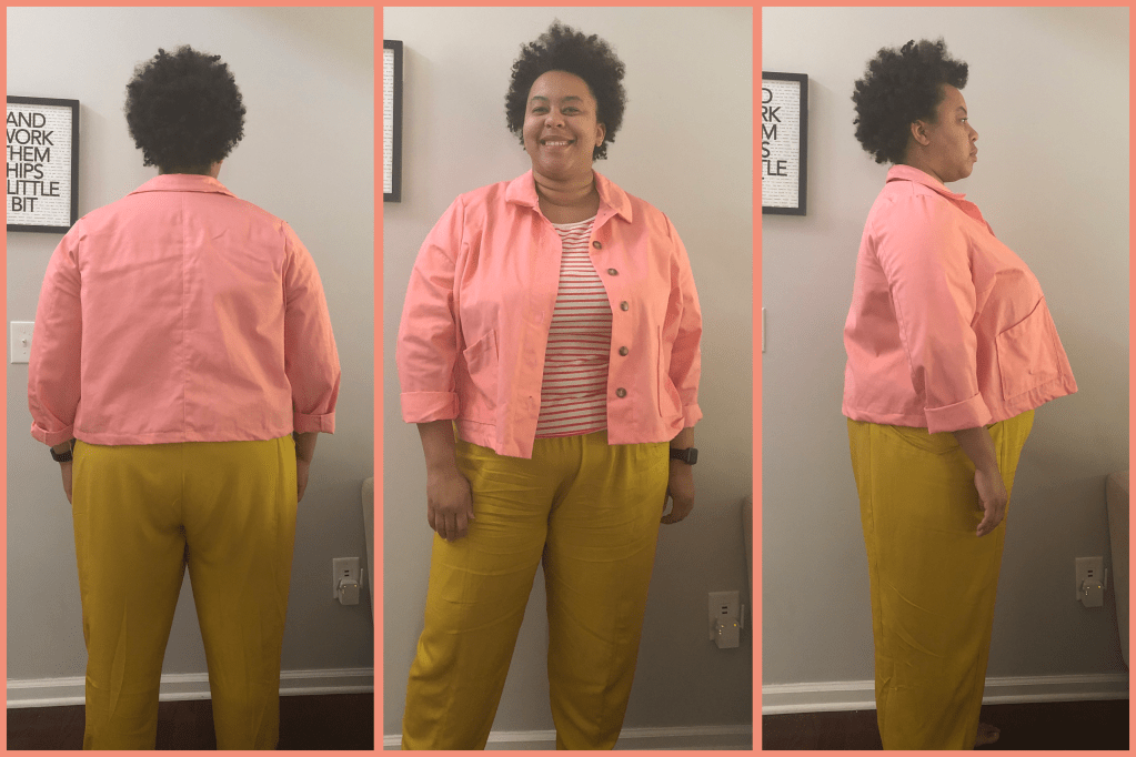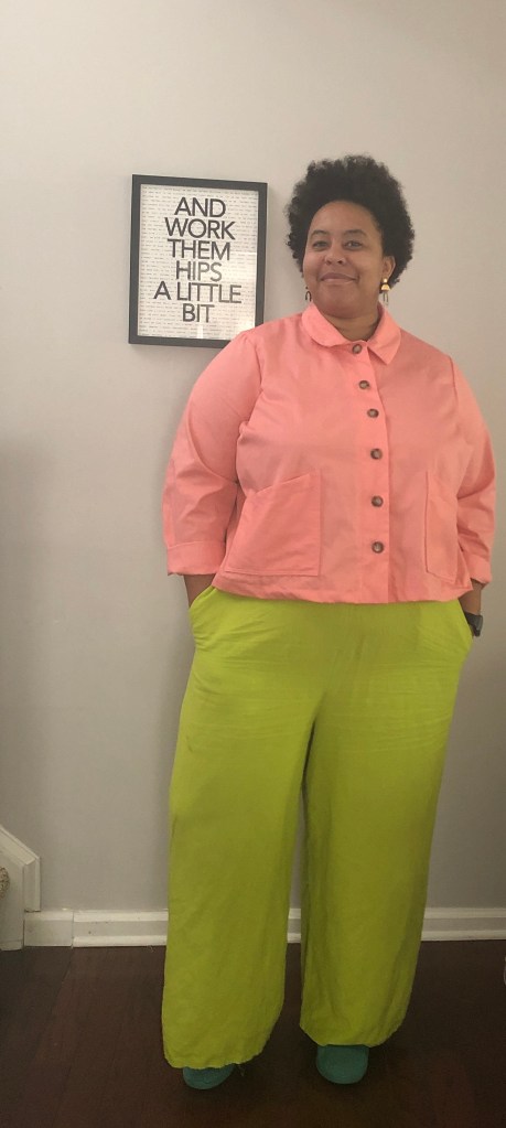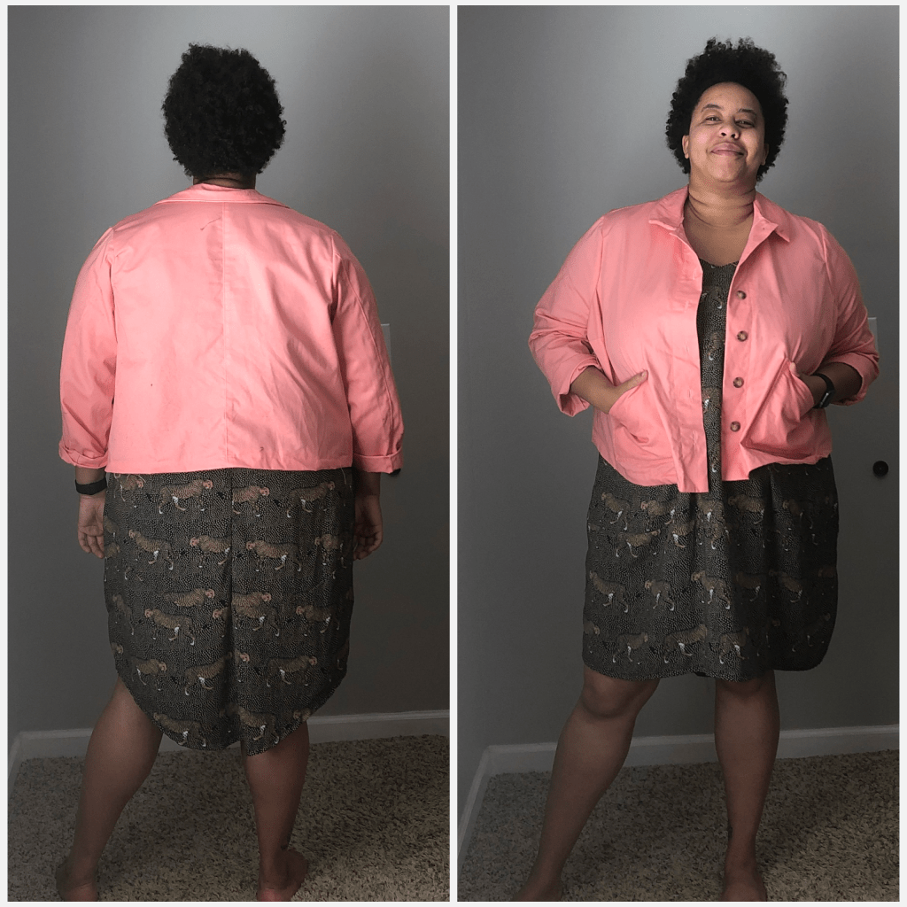 Now that I’ve taken you through my adjustment journey, let me tell you how I feel about the garment. I love it. I know that I made mistakes along the way, but I still really like it. I know what I can improve on in the future and that makes me happy. I love this color and I can wear it with several outfits that are already in my closet. For my next version I think I will either try a size 24 with a (smaller) FBA or a straight size 26. Since it’s supposed to be a boxy silhouette, I don’t know how much grading between sizes or doing the smaller size with FBA will matter. I’ll probably try it both ways and see what I like most. I would like to make a Rhett in a canvas or denim and possibly play around with hand embroidery for a fun detail.