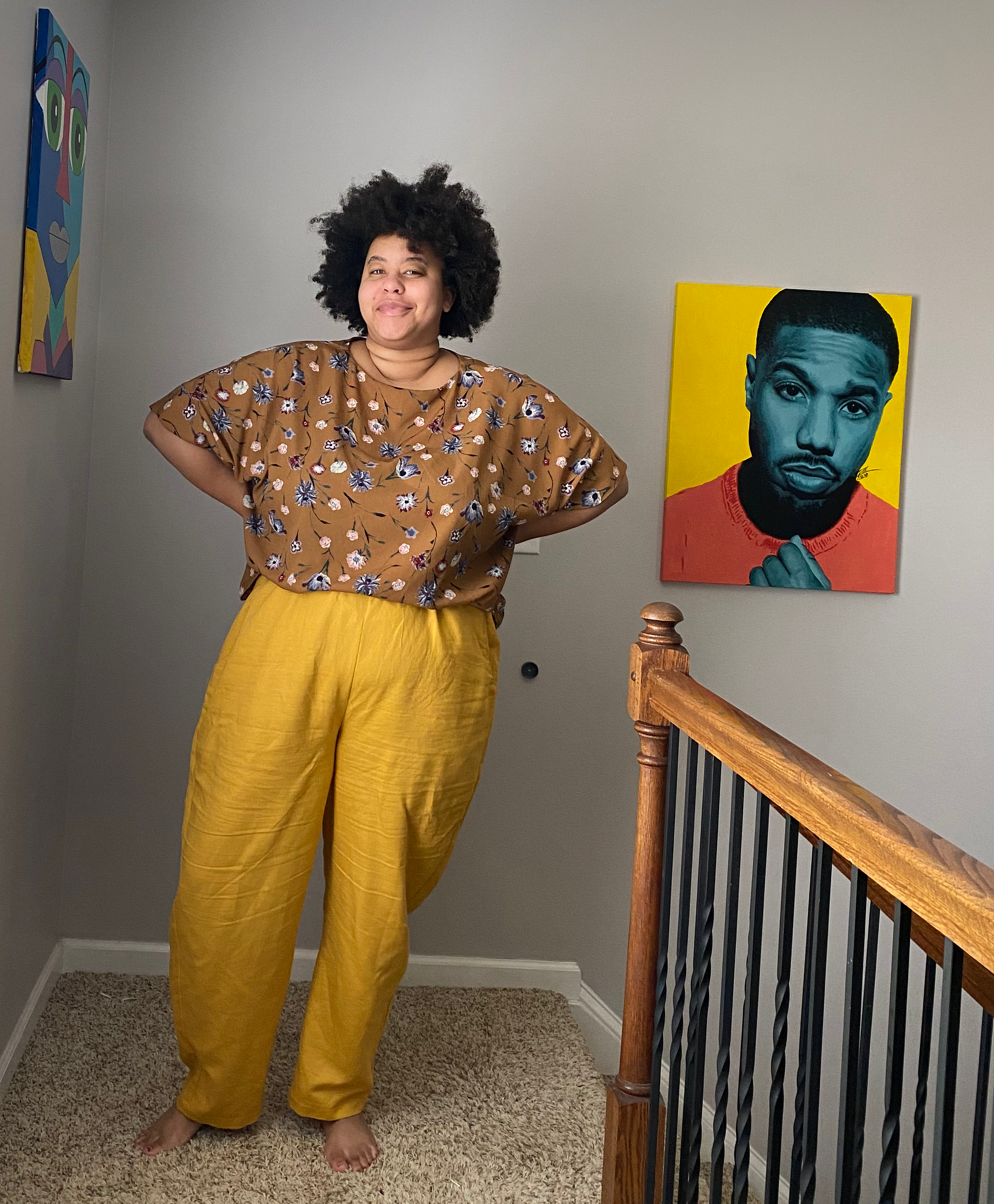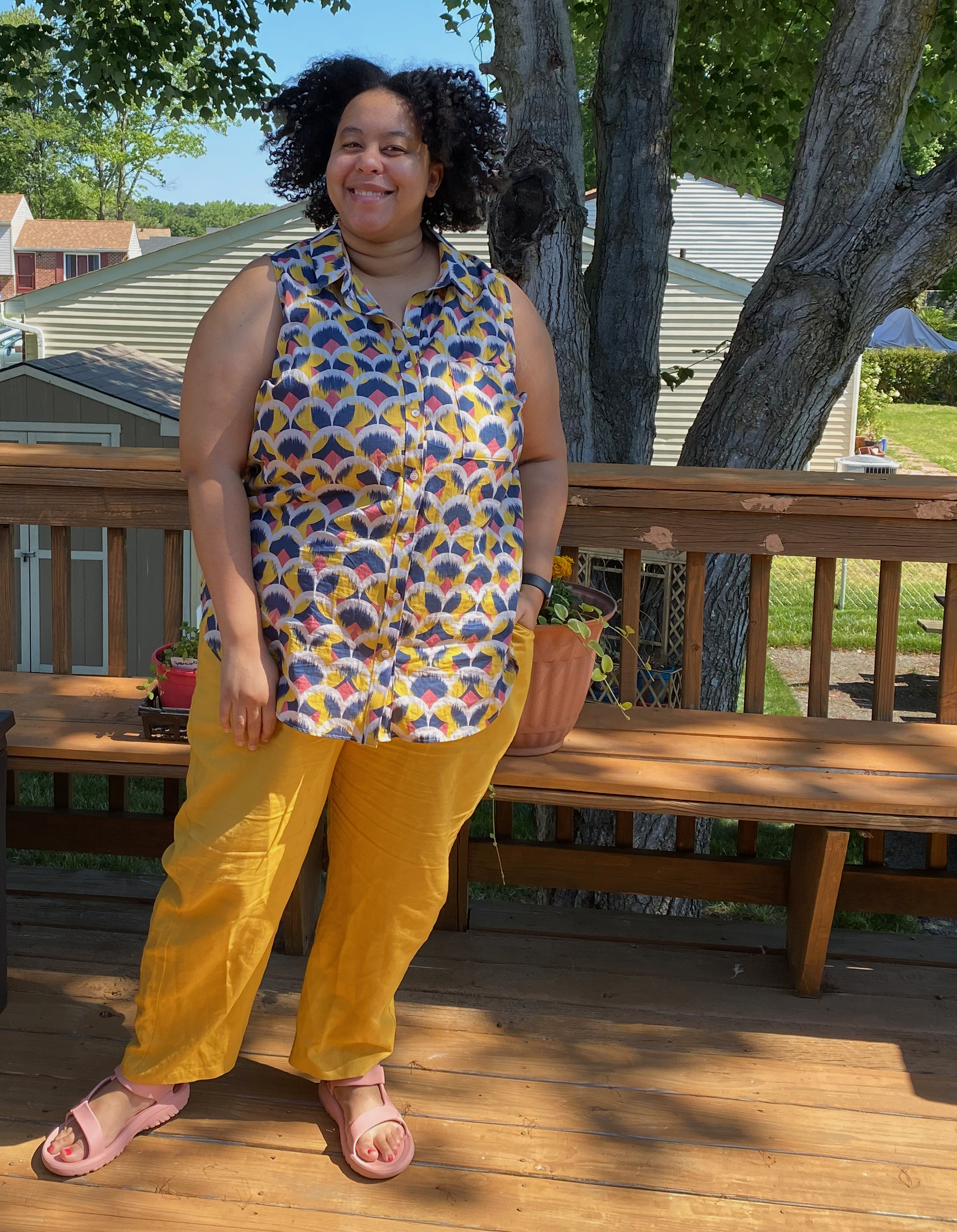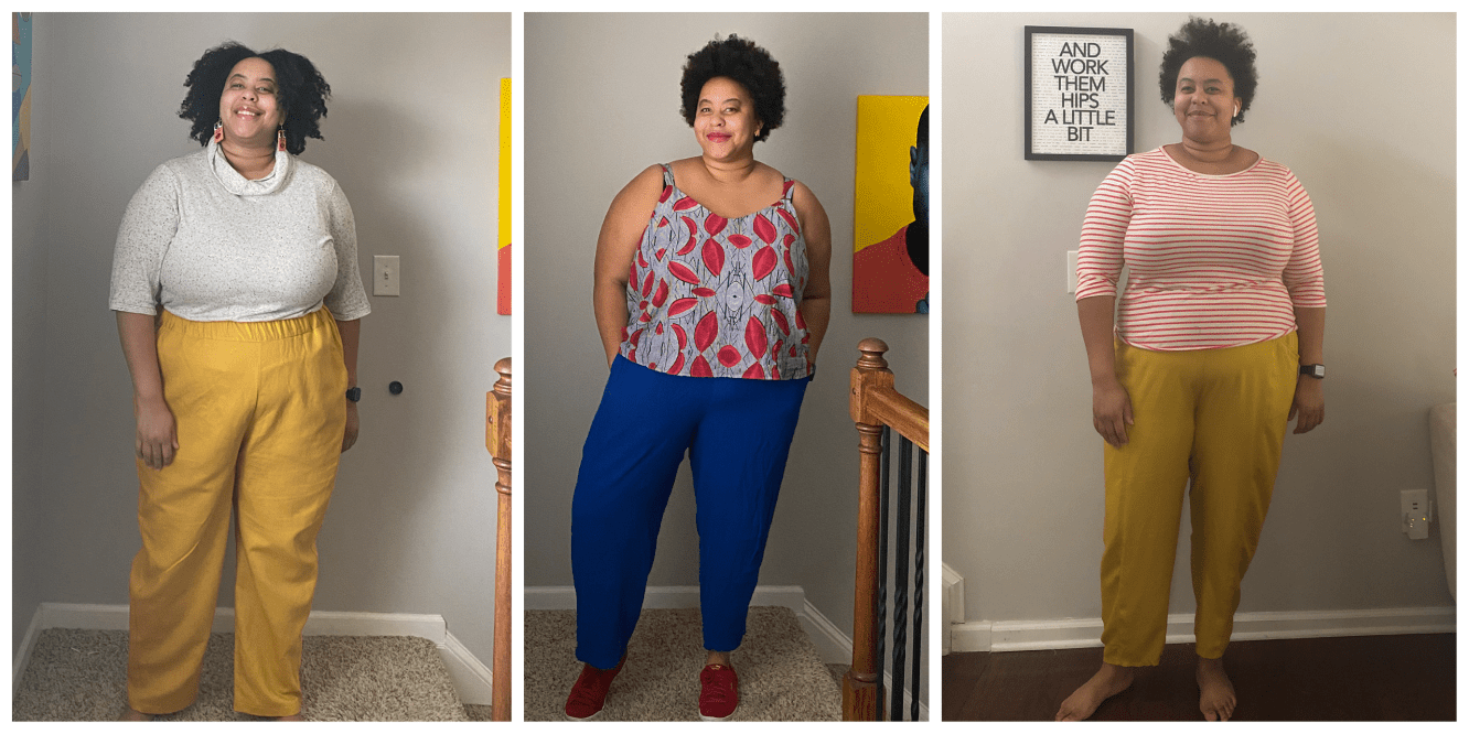Last, but certainly not least are the Birchgrove pants. This is the most recent pattern of the three, and is getting close to being my favorite. I made these in a mustard linen in size G. I went with this size because of my current hip measurement. I probably could also use the size F, but I haven’t tried that yet. These pants feature a fully elasticated waist, deep pockets, and a tapered leg. These came together pretty quickly and are very easy to throw on. I wear them ALL THE TIME. I don’t think the linen I used was great for this pattern, but I already have a cotton twill ready to go. It felt like a home decor linen rather than a garment fabric. These pants show my hyperextended knees more than any other pattern. That doesn’t bother me too much, but I am looking at fitting books to see if there is an easy adjustment.