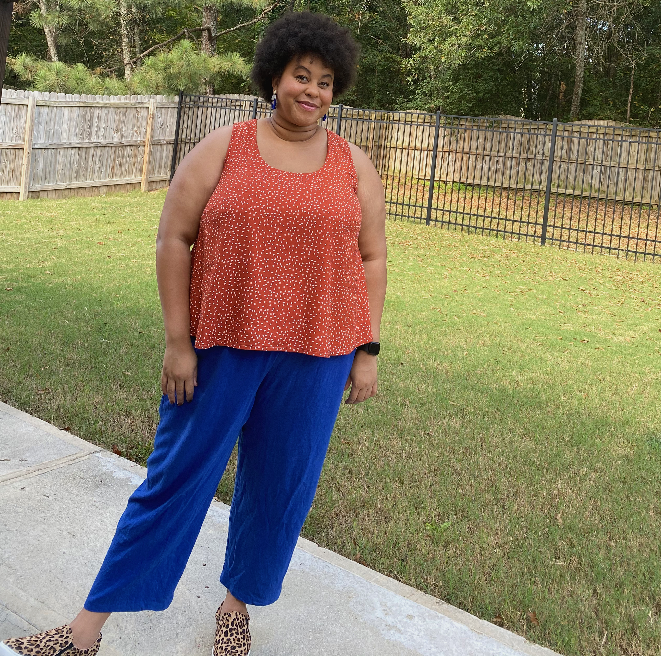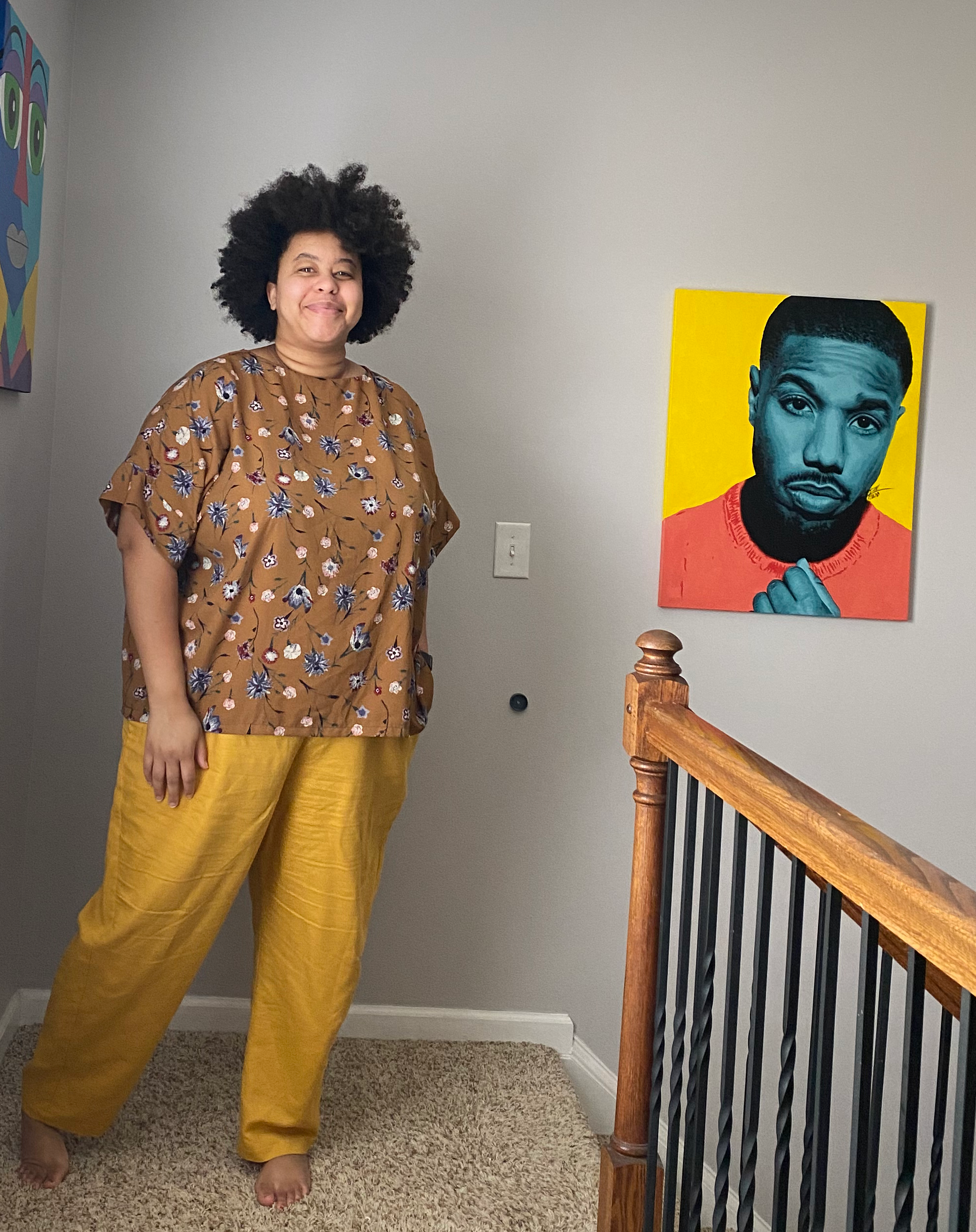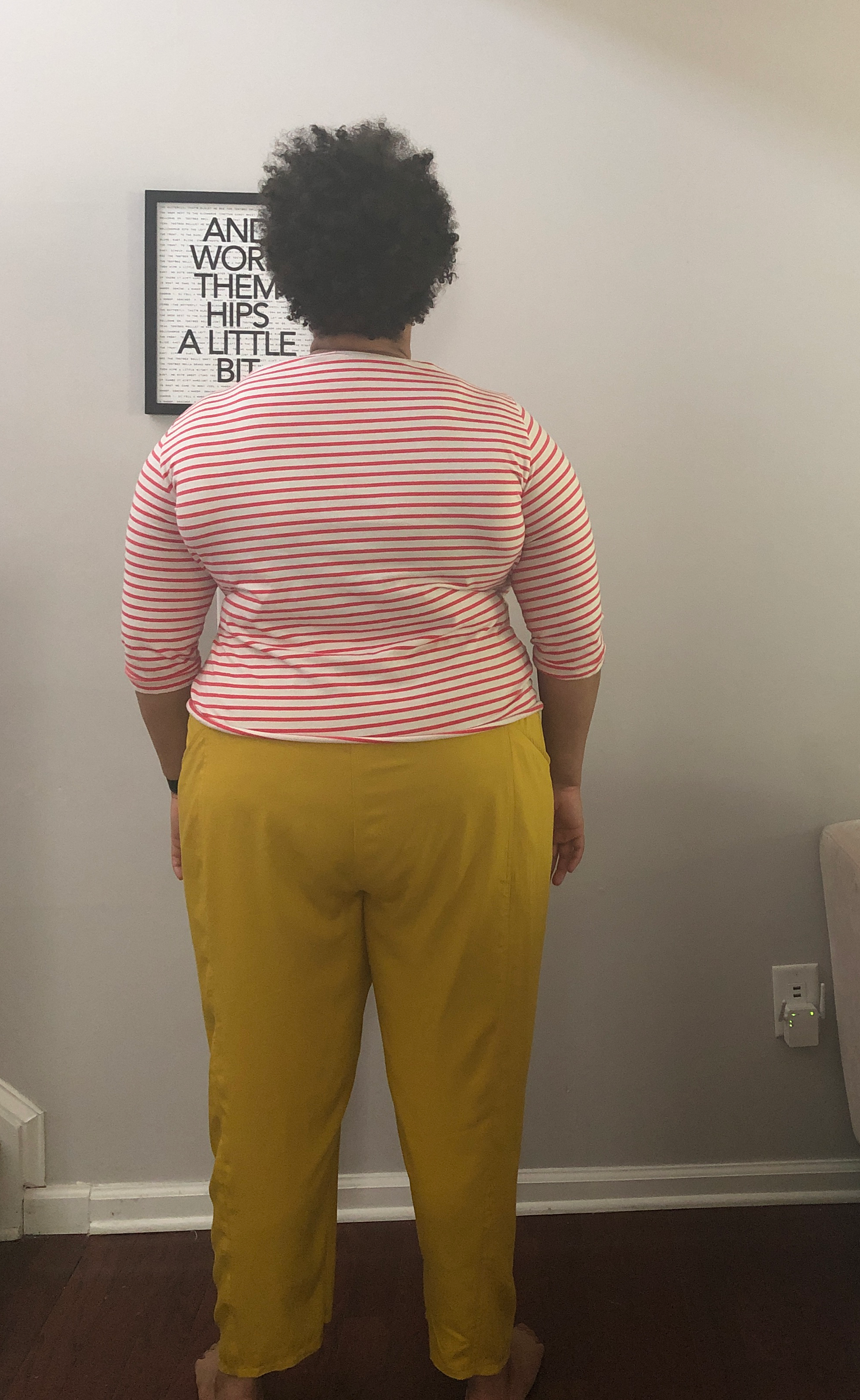 Last, but certainly not least are the Birchgrove pants. This is the most recent pattern of the three, and is getting close to being my favorite. I made these in a mustard linen in size G. I went with this size because of my current hip measurement. I probably could also use the size F, but I haven’t tried that yet. These pants feature a fully elasticated waist, deep pockets, and a tapered leg. These came together pretty quickly and are very easy to throw on. I wear them ALL THE TIME. I don’t think the linen I used was great for this pattern, but I already have a cotton twill ready to go. It felt like a home decor linen rather than a garment fabric. These pants show my hyperextended knees more than any other pattern. That doesn’t bother me too much, but I am looking at fitting books to see if there is an easy adjustment.
