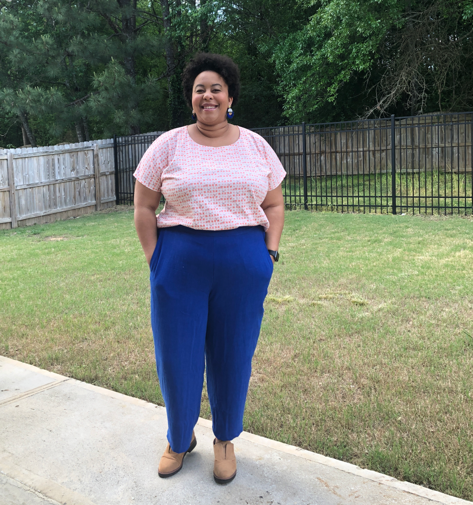 Let’s start with the Willandra pants. I made these in a bright blue viscose linen noil in size 1 (old sizes). When I make them again, I will use size F. These pants feature a diagonal side seam, flat front, elastic back, and tapered leg. They are visually interesting and incredibly comfortable. I like these because they feel sleek while also being comfortable. I plan on making a very fancy pair in the future but I’m not sure what fabric I’ll choose. I’d like to try a rayon twill or rayon challis for a lightweight summer pair.