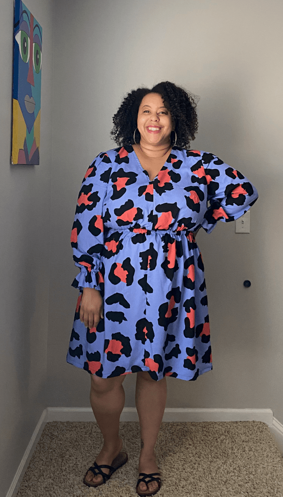 I made the long bishop sleeve version in a rayon challis I picked up from Melanated Fabrics earlier this year. The print caught my eye and I knew it needed to become a dress. I didn’t attempt any pattern matching, and I am totally okay with that. Cutting the pattern pieces on the fold may help me with pattern placement next time. I made the Kineton in a 26 G/H without any adjustments.